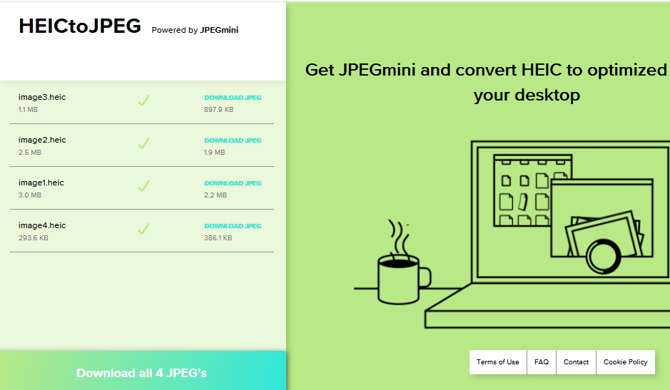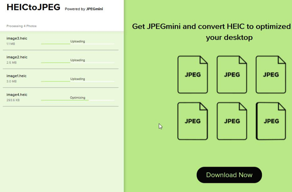 우측에 보이는 Download Now는 누르시면 데스크톱에서 변환을 이용할 수 있는 파일을 받는 링크가 나옵니다. JPEGmini나 HEICtoJPEG의 기능을 프로그램으로 이용하고 싶은 게 아닌 이상 누르지 않고 그냥 변환이 완료될 때까지 기다리시면 됩니다.