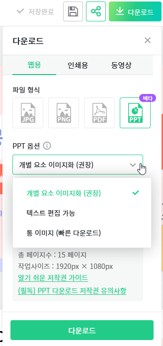 즉 PPT를 [개별 요소 이미지화]나 [텍스트 편집 가능]으로 저장했을 시에는 편집 가능한 형태로 저장되기에 PPT 파일의 공유, 온라인 개시가 불가능해집니다. [통 이미지 (빠른 다운로드)] 옵션으로 다운로드했을 시에는 파일의 수정이 불가능해지니 공유, 온라인 게시가 가능합니다. 학교 과제로 제출하는 등 파일을 타인에게 제출해야 할 필요가 있을 때는 꼭 통 이미지 (빠른 다운로드) 옵션으로 다운로드하시거나 PDF 파일로 다운로드해서 제출하셔야 합니다.