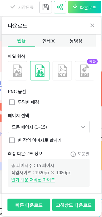 [PNG 옵션] : 배경을 투명하게 할지 결정할 수 있습니다. PNG로 다운로드할 때만 가능합니다.