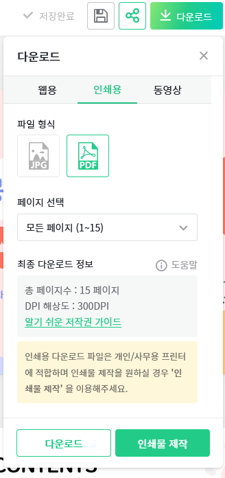 [파일 형식] : 웹용은 JPG, PNG, PDF, PPT 중에 하나, 인쇄용은 JPG, PDF, 동영상은 MP4와 GIF 중 하나를 결정해서 다운로드할 수 있습니다.
